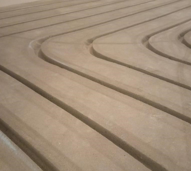 System powstaje poprzez wyfrezowanie w istniejącej wylewce rowków o głębokości 2–2,5 cm i szerokości 1,7 cm, w które wprowadza się rury PEX rozprowadzające ciepło po całym pomieszczeniu.